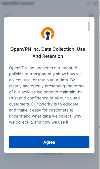 Quando a instalação estiver concluída, inicie o aplicativo OpenVPN Connect. Na primeira vez que abrir o aplicativo ele exibirá uma mensagem sobre a coleta, uso e retenção de dados. Clique no botão Agree e continue.
