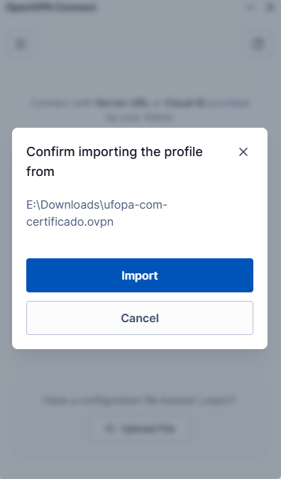 Na próxima tela, observe que o aplicativo contém dois blocos. Na parte inferior, clique no botão Upload File (Figura 2) e você irá inserir o arquivo de configuração que você baixou chamado ufopa-com-certificado.ovpn, navegando pelos diretórios até a pasta onde você fez o download. Também é possível arrastar este arquivo para a janela de configuração do OpenVPN. Na pŕoxima janela, é só confirmar no botão Import (Figura 3);