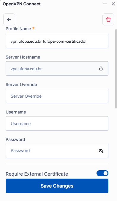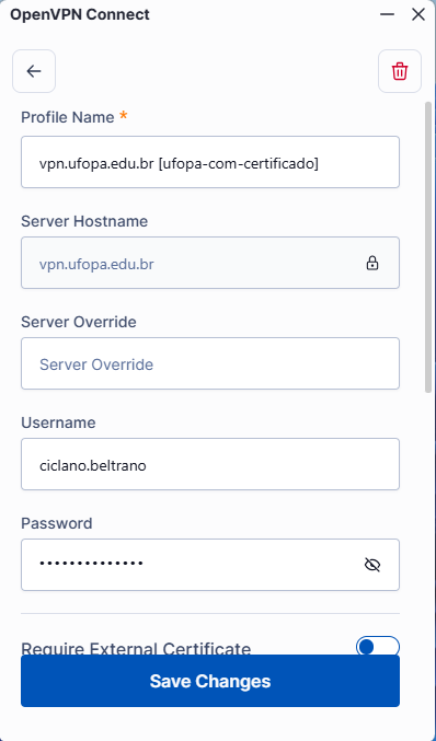 - Em seguida, insira os seus dados de acesso aos sistemas institucionais. Em Username coloque sua identificação (usuario dos SIGs - SIGRH, SIGAA,SIPAC) e no campo Password coloque a sua senha. Desative o botão deslizante para Required External Certificate e clique em Save Changes (Figura 7 e 8).
