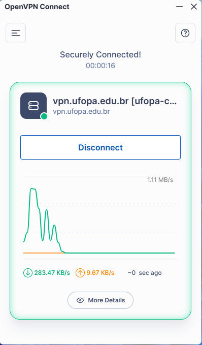 Para desconectar da VPN basta clicar no botão Disconnect e depois confirmar.