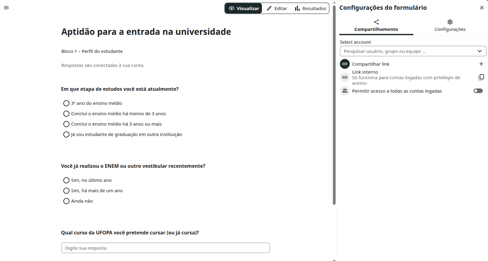 Essas opções garantem flexibilidade para pesquisas com escopo interno (apenas comunidade UFOPA) ou externo (parceiros e públicogeral).
