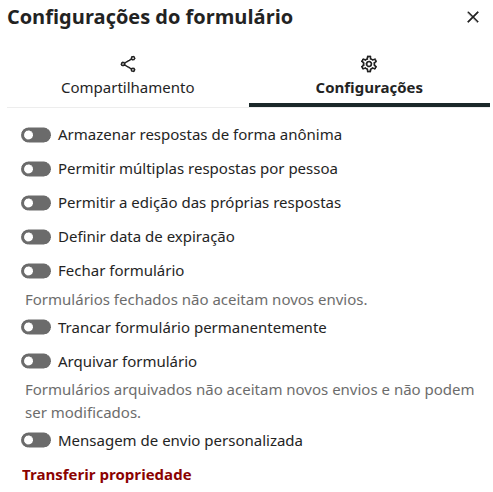 - Transferir propriedade: Designa outro membro da comunidade acadêmica como responsável administrativo do formulário, facilitando transferências de responsabilidade entre equipes ou gestões.