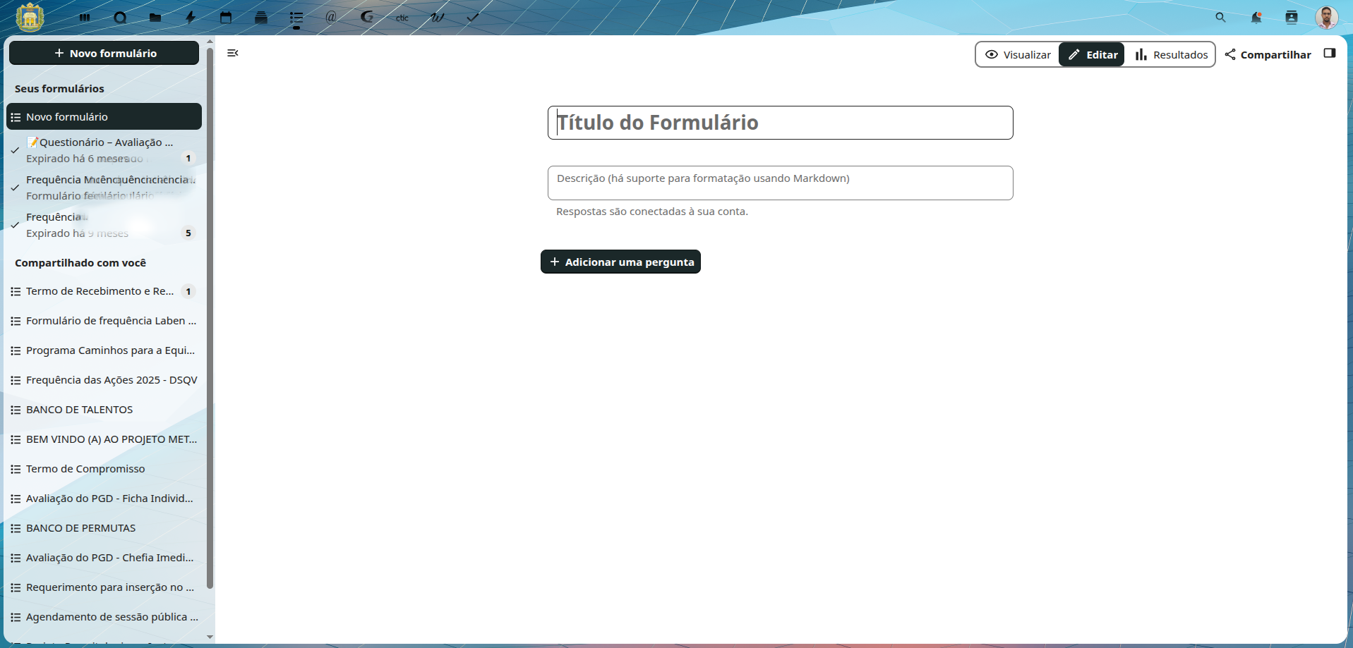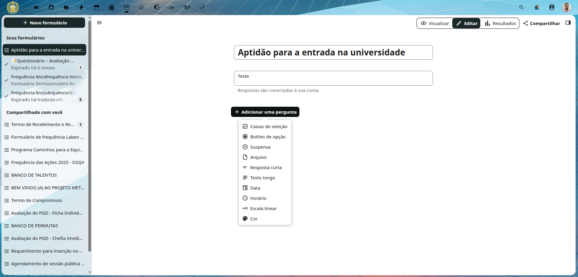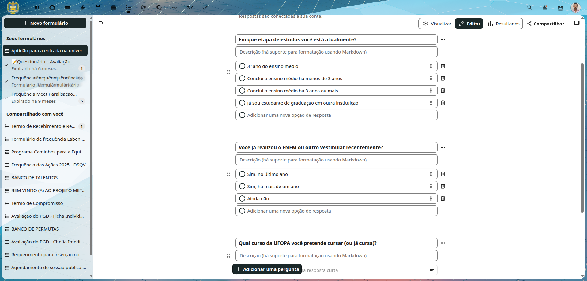 - “Compartilhado com você”: Formulários que outros usuários da comunidade acadêmica compartilharam para colaboração.