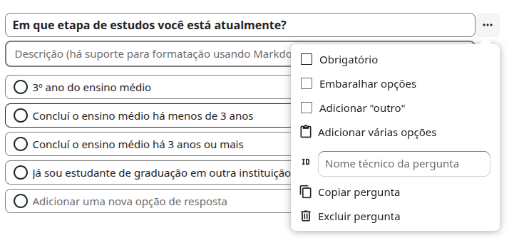 - Descrição: Campo de apoio que suporta formatação em Markdown, permitindo instruções detalhadas, contexto ou informações adicionais aos respondentes.
